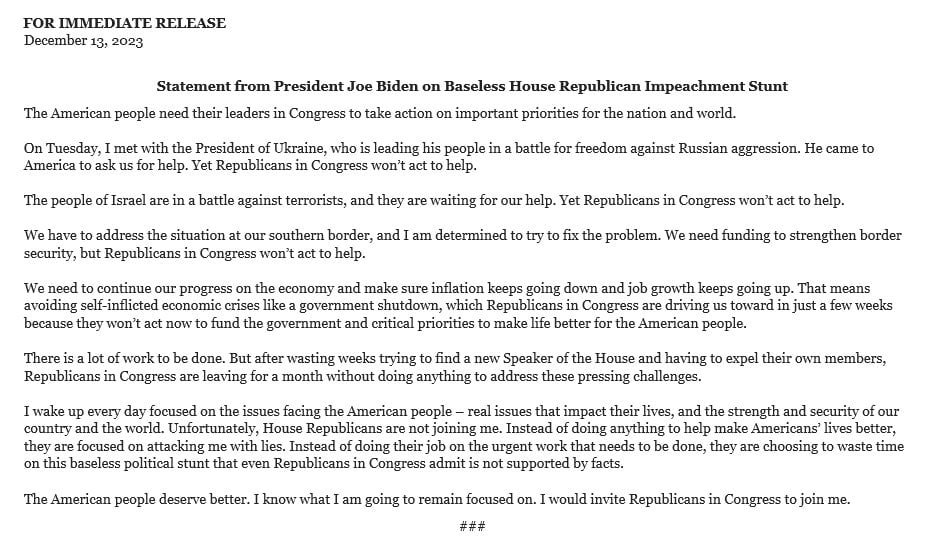 The President issued a statement on the impeachment proceedings begun against him by House Republicans.