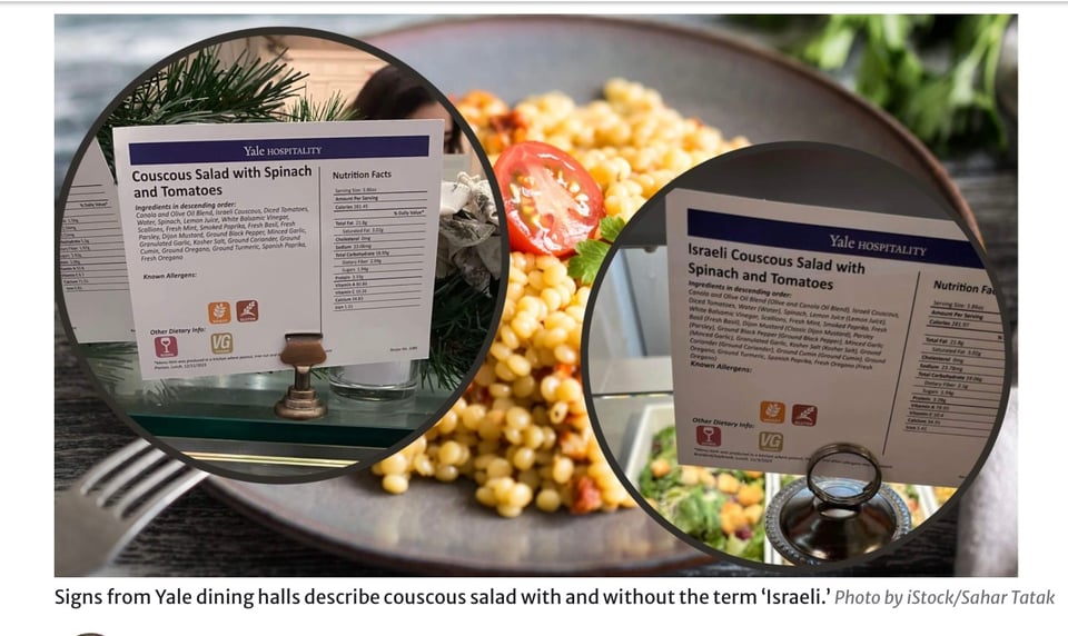 At Yale, the years-old, popular "Israeli couscous salad with spinach and tomatoes," has been renamed in our dining halls as the same exact dish but without the word "Israeli."