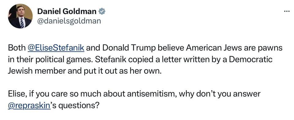 Tartak also tagged President Joe Biden, Elon Musk, CNN, The New York Times and other media outlets, celebrities and politicians, including Rep. Elise Stefanik, who made headlines last week grilling the presidents of MIT, Harvard and the University of Pennsylvania in Congress.