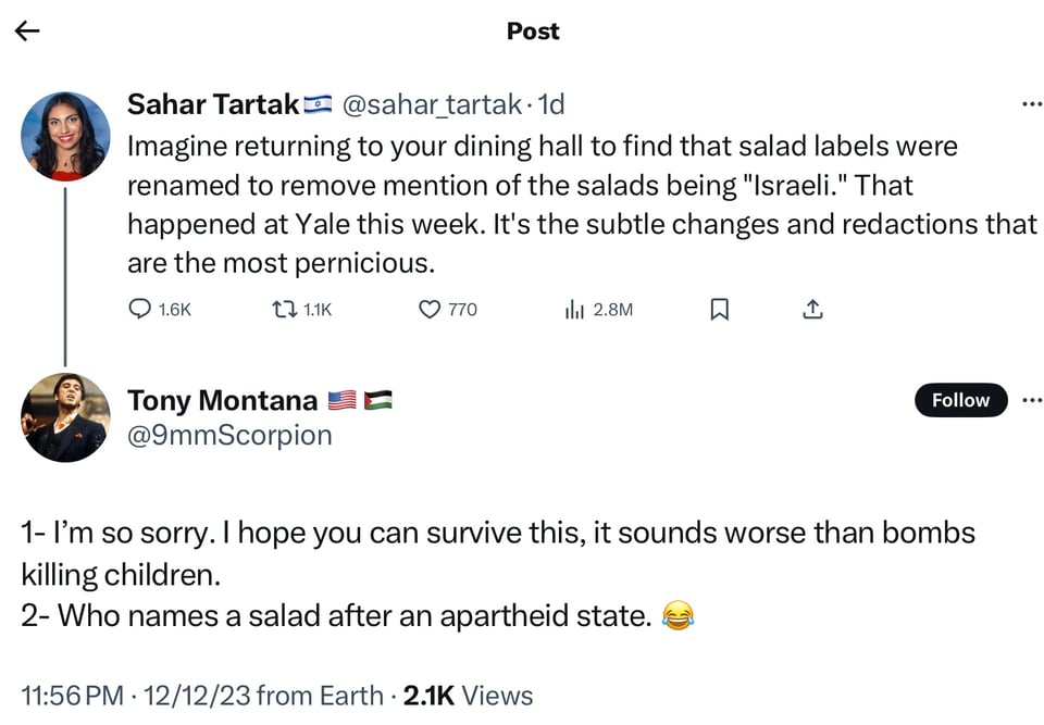 It started Sunday, when Yale student Sahar Tartak wrote on the social media platform X that the “years-old, popular ‘Israeli couscous salad with spinach and tomatoes,’ has been renamed in our dining halls as the same exact dish but without the word ‘Israeli.’”