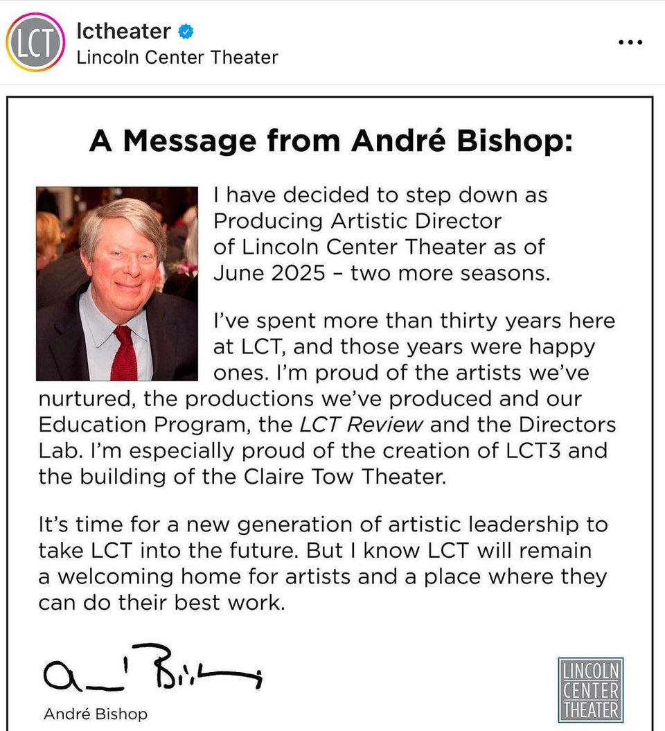 Bishop, 74, said he is choosing to leave at the end of the 2024-25 season because that is when his current contract ends, and because that will allow him to join in that season’s celebrations of Lincoln Center Theater’s 40th anniversary.