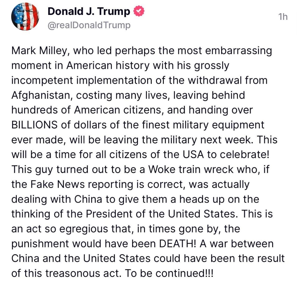 Trump threatened the former Chairman of the Joint Chiefs of Staff, the nation's highest-ranking military officer, with DEATH.