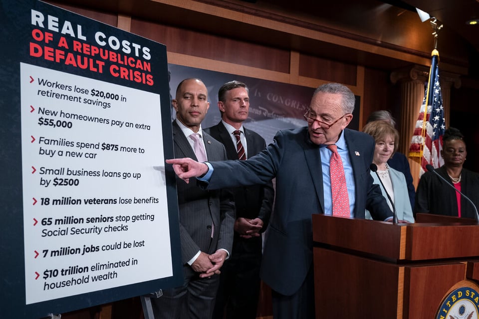 Senator Chuck Schumer, the majority leader, and other congressional Democrats, criticizing Republicans for trying to block efforts to raise the debt limit.