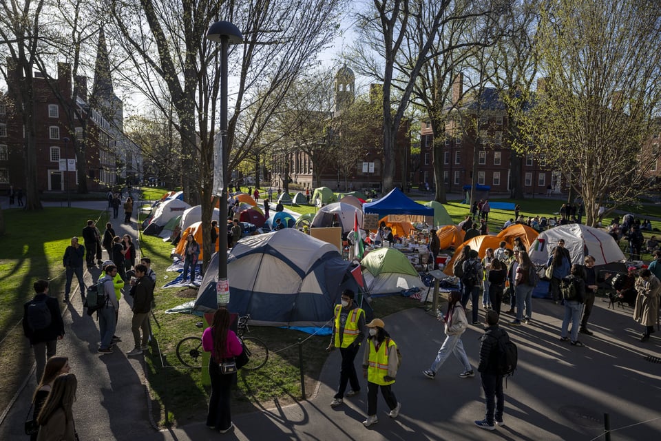 Students protesting against the war in Gaza, and passersby walking through Harvard Yard, are seen at an encampment at Harvard University in Cambridge, Mass., on April 25, 2024.