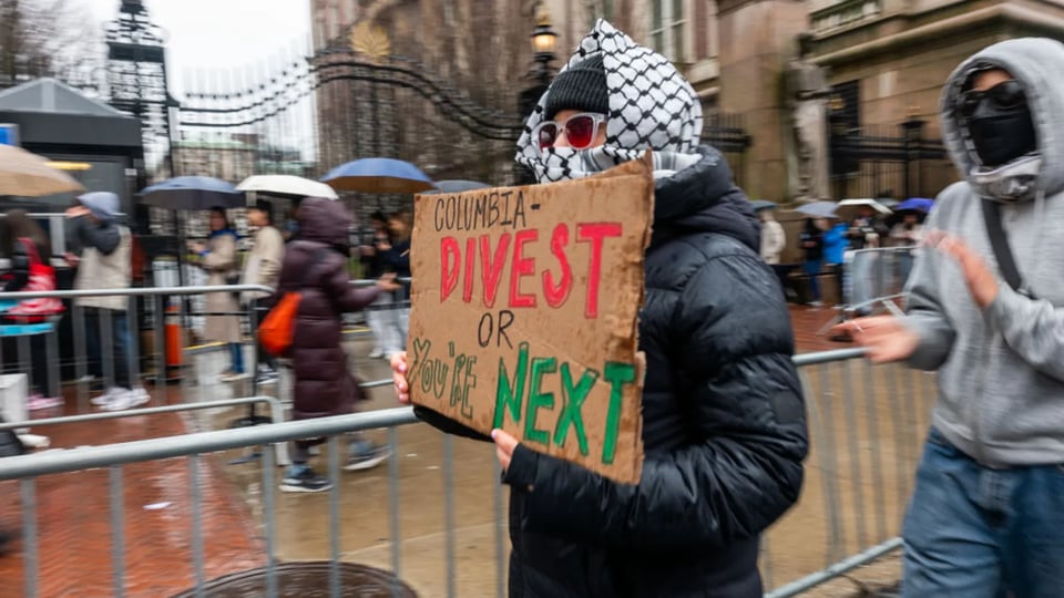 Demonstrators outside of Columbia University, in New York City, N.Y., hold a protest on March 24, 2025, in part to oppose the institution’s decision to cede to the Trump administration’s demands. Faculty protests against surrendering happened at Columbia again yesterday.