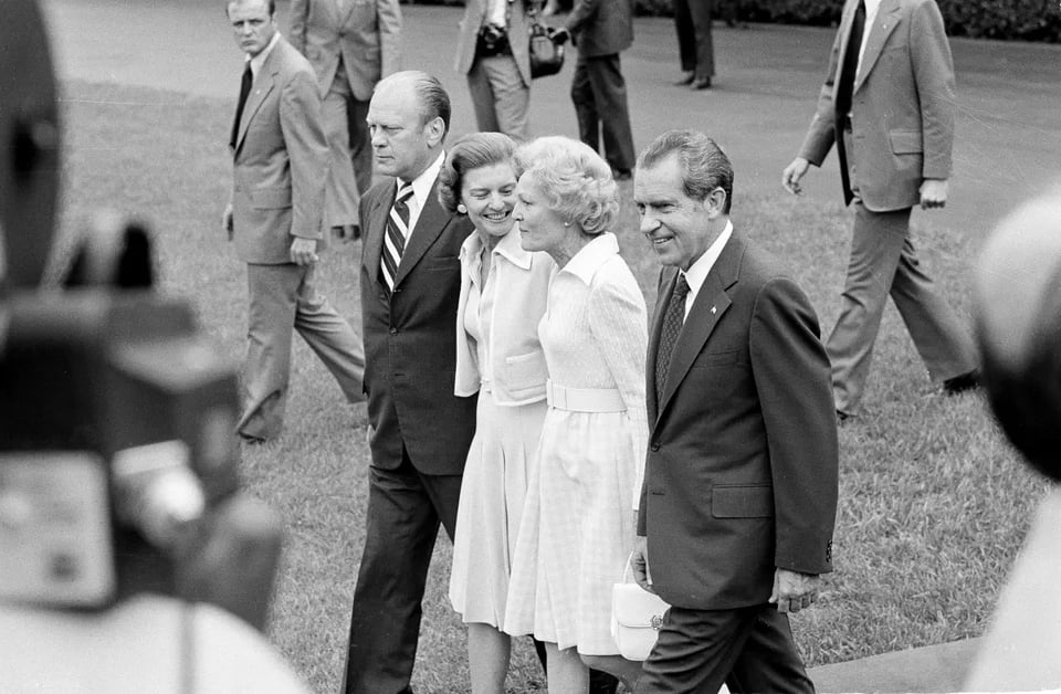 President Ford, left, and former President Nixon, right, flank their wives, Betty Ford and Pat Nixon, as the Nixons leave the White House in 1974