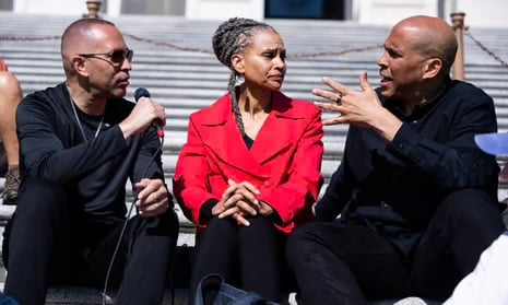 From left, Hakeem Jeffries; Maya Wiley, president of the Leadership Conference on Civil and Human Rights; and Cory Booker, at the US Capitol on Sunday.