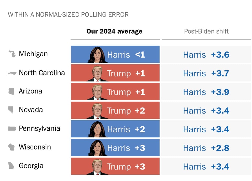 Where we are now is not crystal clear. According to the Washington Post, for instance, Trump is still leading in 4 of these states but Harris-Walz are moving forward. Check out the Post-Biden shift👇.
