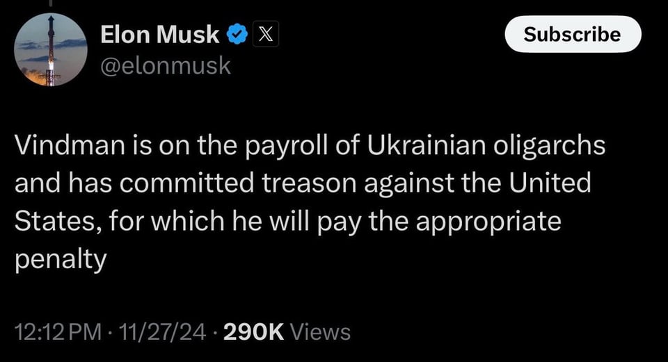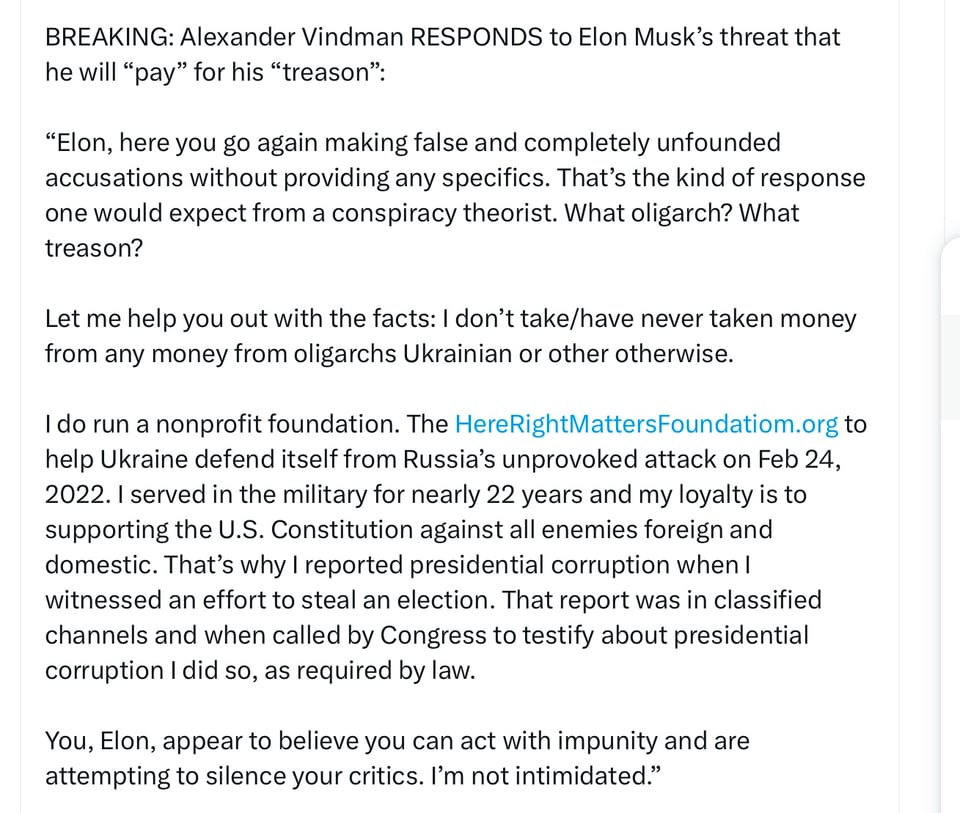 Elon Musk has accused Alexander Vindman of working for Ukrainian oligarchs, labeling him a traitor and implying he could face the death penalty. pic.twitter.com/3ht7Fx99r7