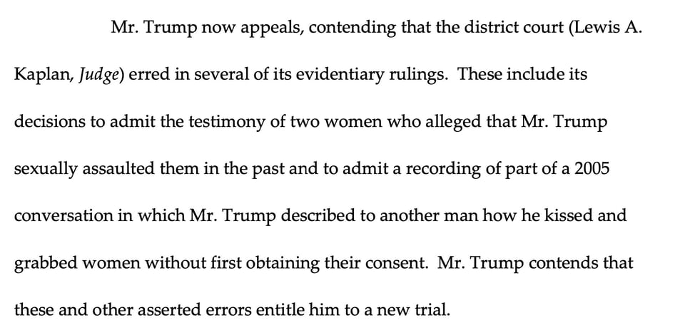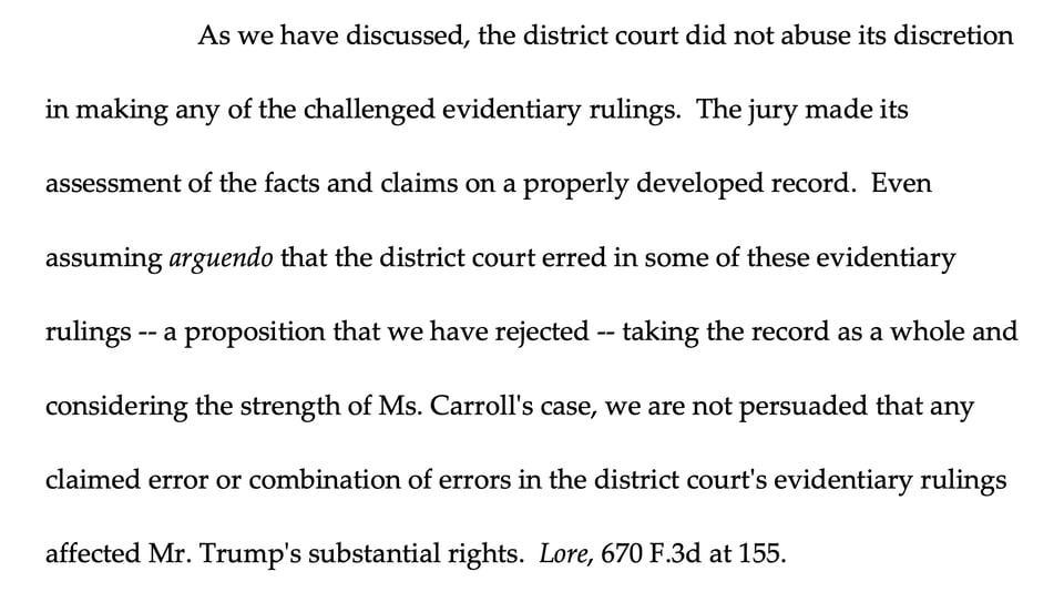 Trump complained that Judge Kaplan improperly admitted certain types of evidence at trial. The Court of Appeals found there was no abuse of discretion and affirmed the verdict and award of damages to E. Jean Carroll.