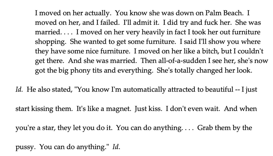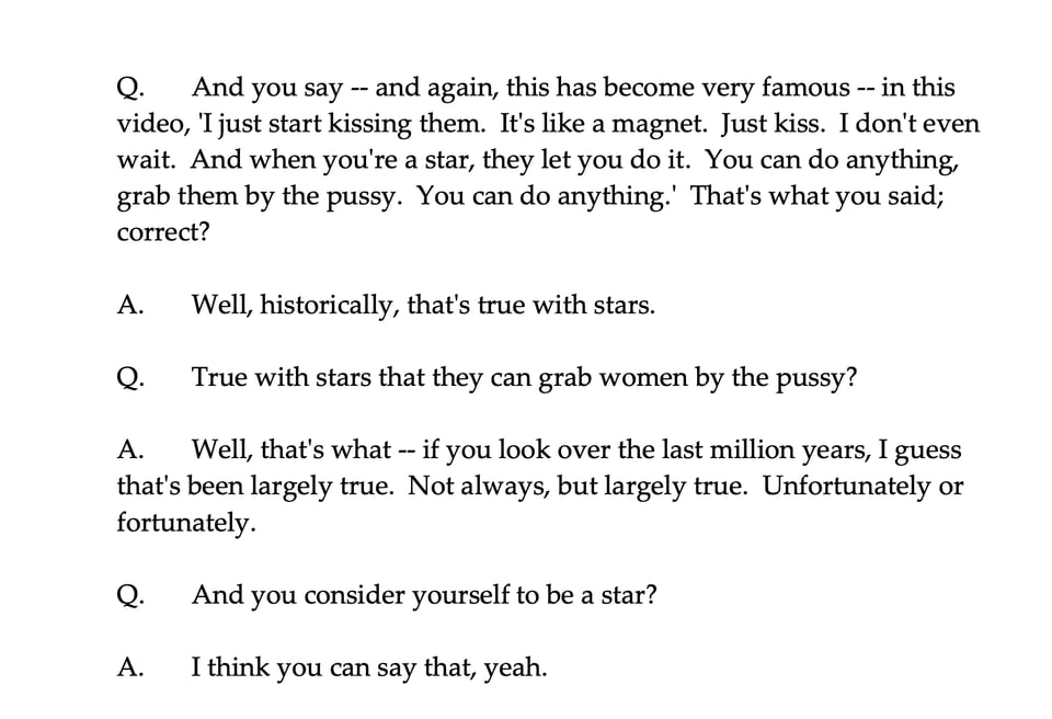 The infamous Access Hollywood tape was played twice for the jury. In the recording, Mr. Trump states that he "moved on" a woman named Nancy "like a bitch" and "did try and fuck her." The first block below is what Trump says in the tape, as related by the court. The second one is Trump’s deposition testimony about it (the same deposition where he misidentified a photo of Carroll at the time as one of his second wife, Maples):