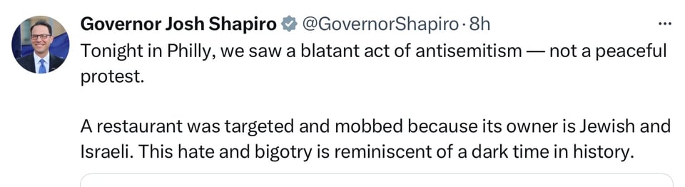 Governor Shapiro shared a clip of the protest on X and described it as “a blatant act of antisemitism — not a peaceful protest.”