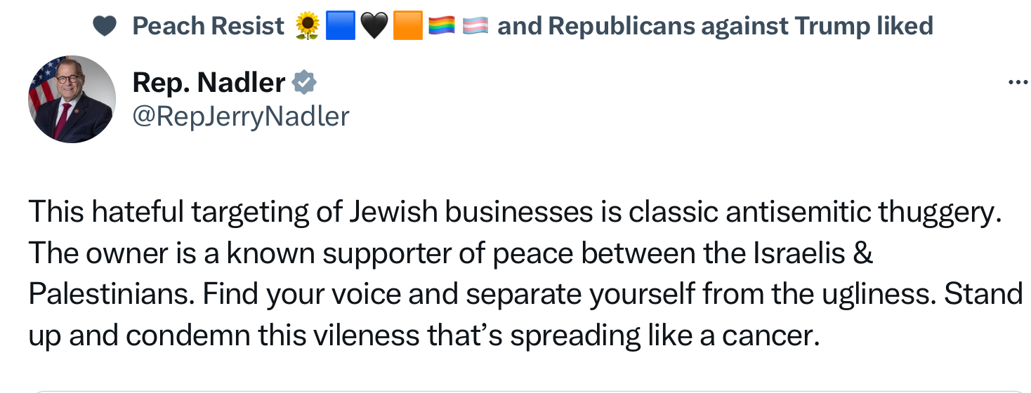 Axios PM. White House spokesperson Andrew Bates today called it "antisemitic and completely unjustifiable to target restaurants that serve Israeli food over disagreements with Israeli policy."