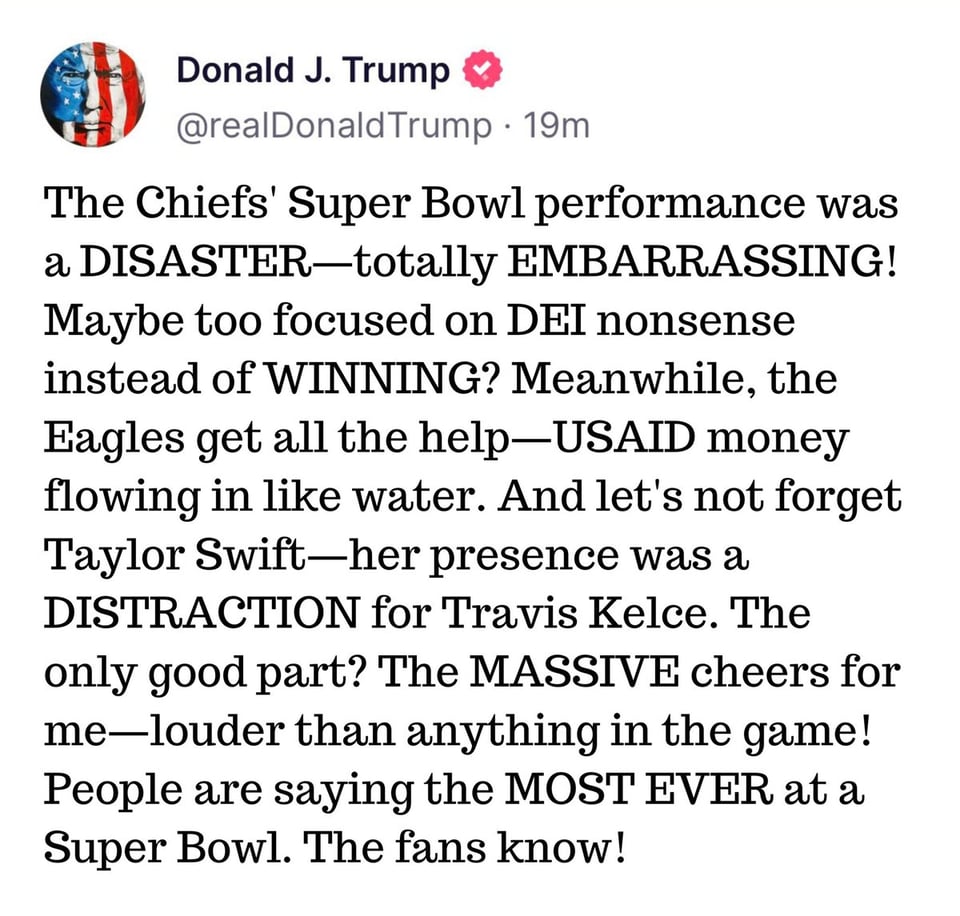 Whatever Trump touches, dies. Ask the Chiefs. Congratulations to the Eagles.