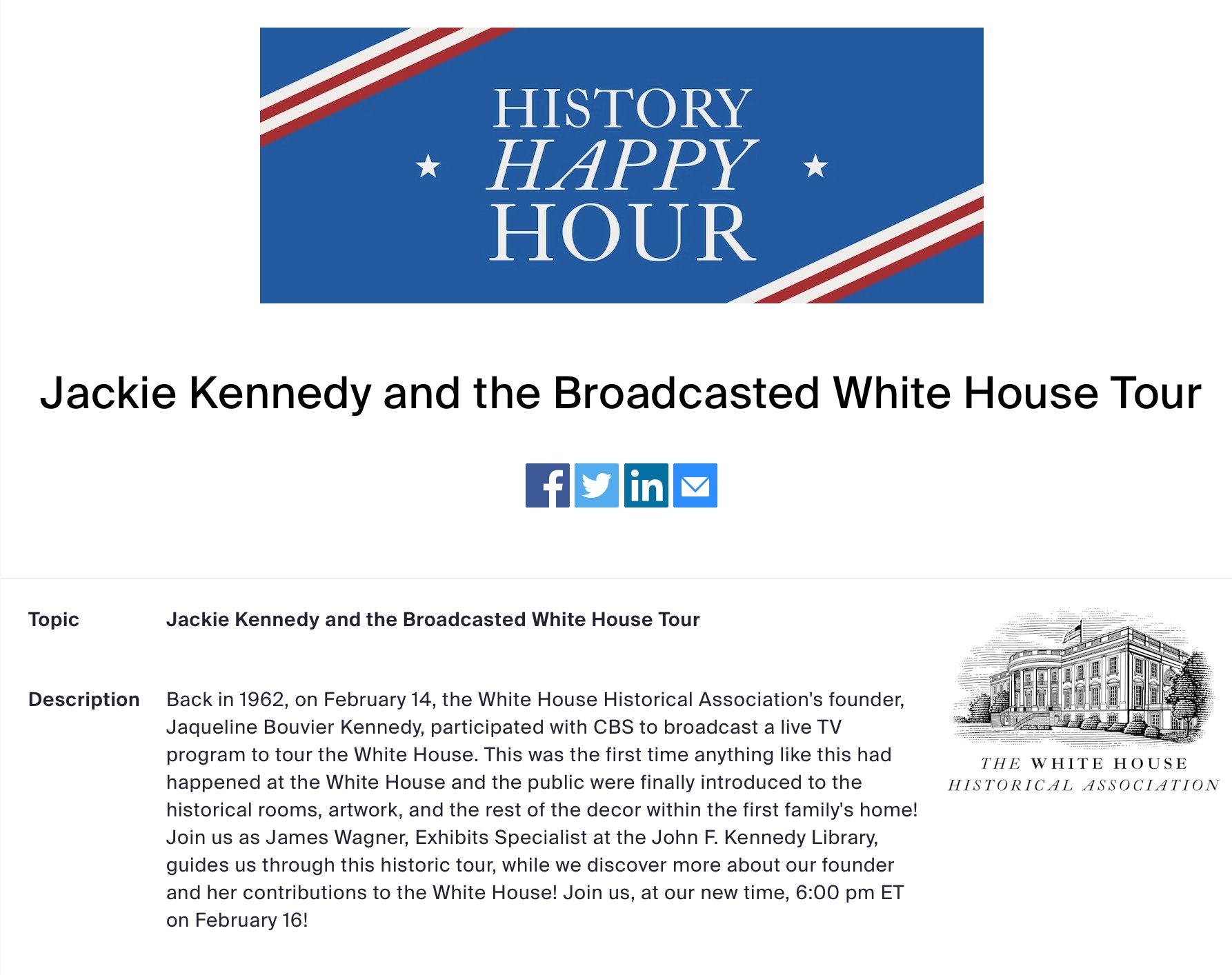 Looking for an uplifting activity? 6 pm Friday, Feb. 16… Jackie Kennedy’s Famous Tour of the White House. Shh. Whisper the news.