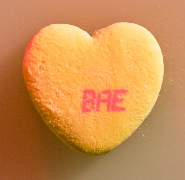 The sayings on candy hearts are reviewed each year, with new ones added and dated ones removed. Bae is a nickname for a lover that some say stands for “before anyone else” and others say is an abbreviation for “baby.”