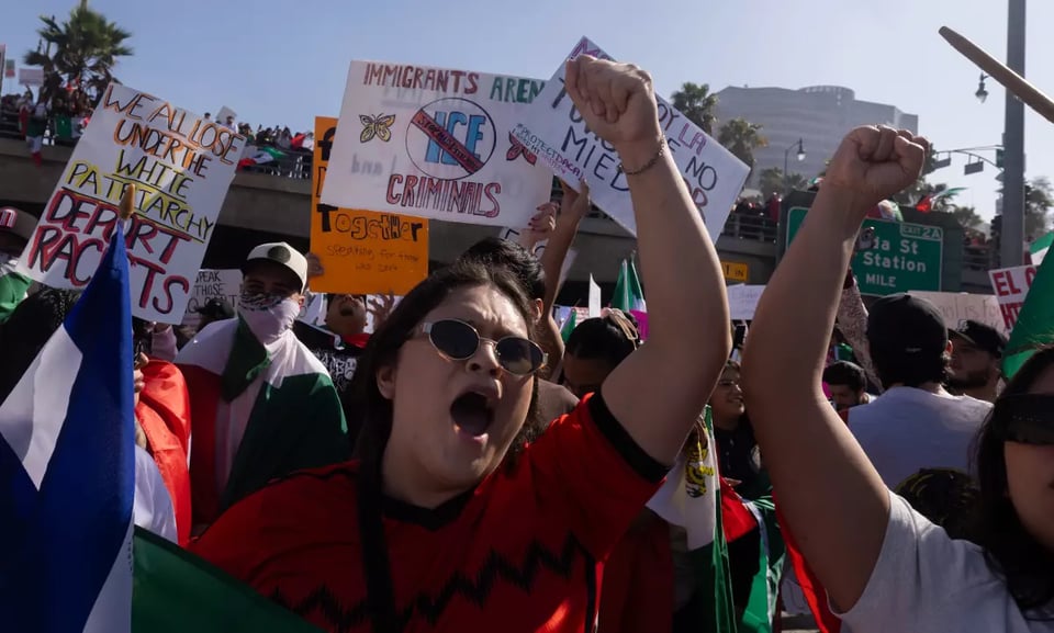 By 1 p.m., the number of protesters ballooned to several thousand, with some carrying signs that said, “MAGA — Mexicans always get across”; “Don’t bite the hand that feeds you,” referring to the state’s agricultural workers; and “I drink my horchata warm because f— I.C.E.,” a reference to the U.S. Immigration and Customs Enforcement agency.