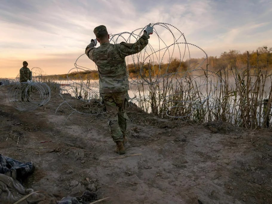 Texas National Guard soldiers install additional razor wire lie along the Rio Grande on Jan. 10 in Eagle Pass, Texas.