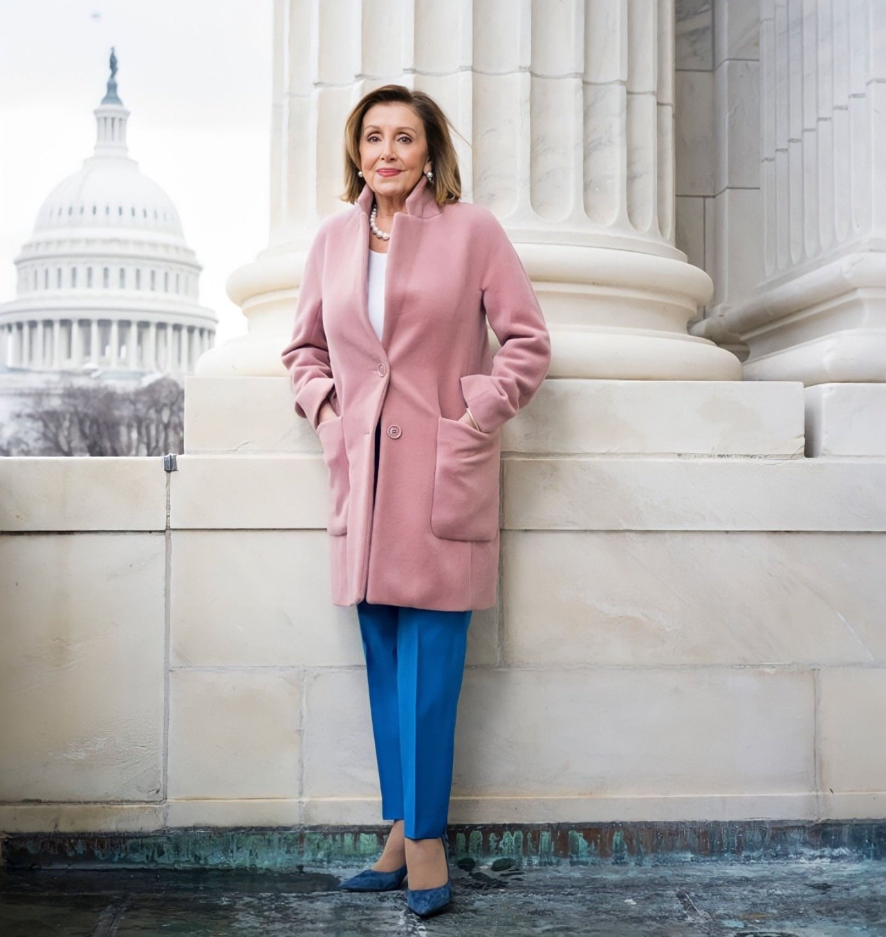 I was expecting King Lear, howling at the storm, but I found Gene Kelly, singing in the rain. Pelosi was not crying in her soup. She was basking as she scarfed down French fries, a truffle-butter roll and chocolate-covered macadamia nuts — all before the main course. She was literally in the pink, ablaze in a hot-pink pantsuit and matching Jimmy Choo stilettos, shooting the breeze about Broadway, music and sports. Showing off her four-inch heels, the 82-year-old said, “I highly recommend suede because it’s like a bedroom slipper.” (Source. NY Times. Maureen Dowd).