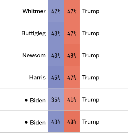 Although a CNN poll found that Ms. Harris was two percentage points ahead of Mr. Biden in a hypothetical contest against Mr. Trump, she still lost to Mr. Trump in the survey.