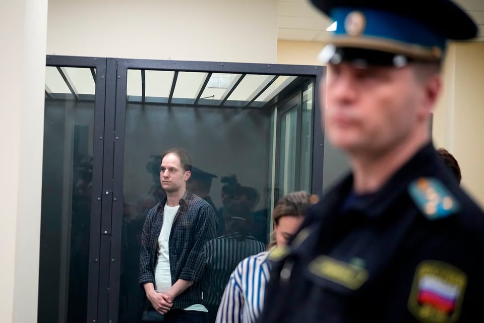Wall Street Journal reporter Evan Gershkovich, left, stands in a glass cage in a courtroom at the First Appeals Court of General Jurisdiction in Moscow, Russia, Tuesday, April 23, 2024.