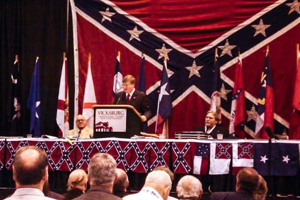 Reeves’ ties to the SCV stretch back long before his time as governor. In 2013, he spoke to the SCV’s national gathering in Vicksburg, Miss., in front of a massive Confederate battle flag and in a room decorated with smaller Confederate flags and cotton plants. After then-Lt. Gov. Reeves congratulated the organization for “keeping history for our youth,” speakers defended the Confederate “cause” and compared “Yankees” to German “Nazis” in World War II.