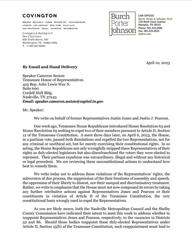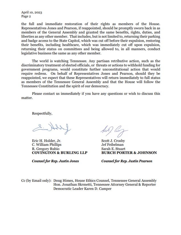 Attorneys for Justin Jones and Justin Pearson ,including former AG Eric Holder, warned House Speaker Cameron Sexton against interfering with their reappointments. Sexton's office says they have no such intentions.