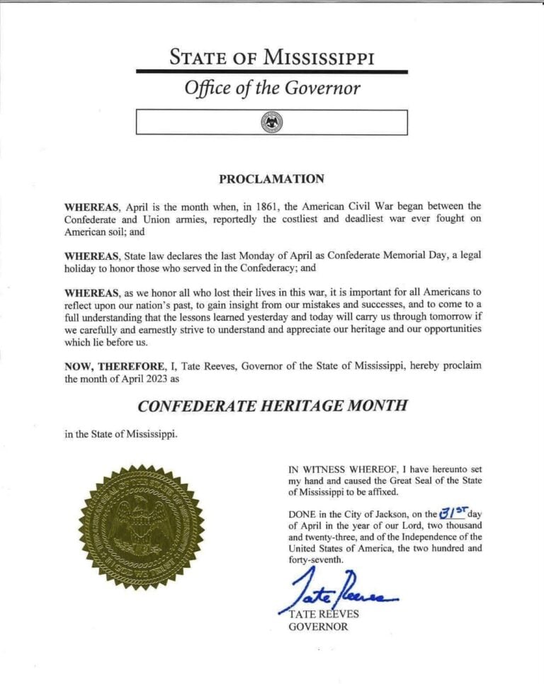 “Now, therefore, I, Tate Reeves, Governor of the State of Mississippi, hereby proclaim the month of April 2023 as Confederate Heritage Month in the State of Mississippi.”