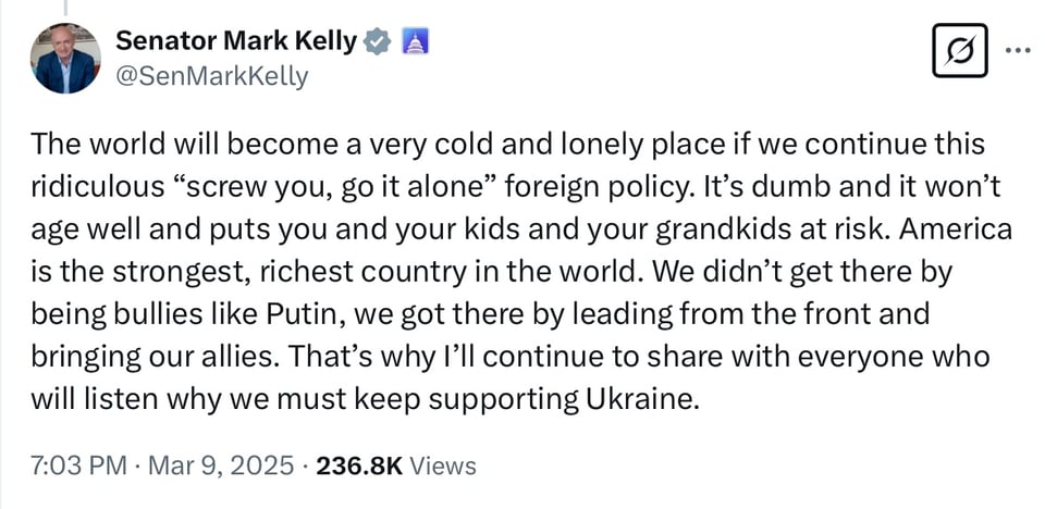 — Senator Mark Kelly (@SenMarkKelly) March 9, 2025