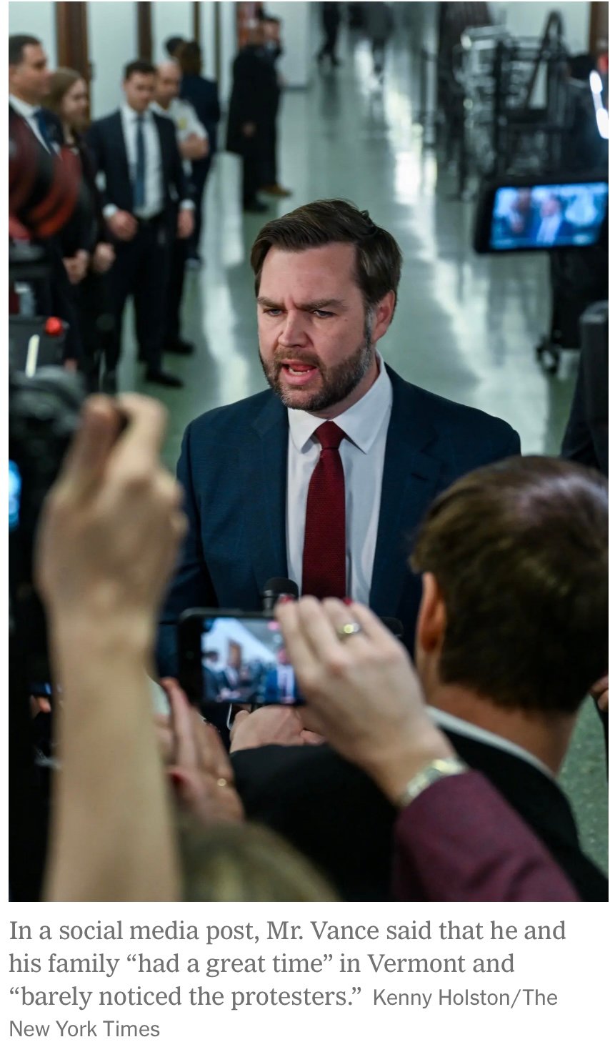 For his part, Mr. Vance said in a posting on X on Tuesday that he and his family “had a great time” in Vermont and “barely noticed the protesters.”