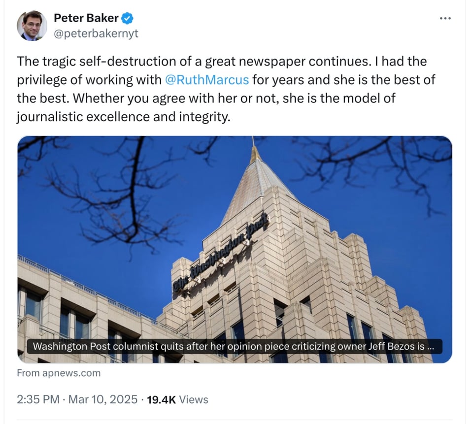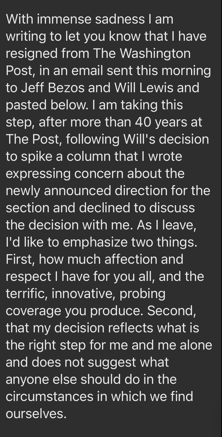 "I love the Post," Marcus wrote at the end of her resignation letter. "It breaks my heart to conclude that I must leave. I have the deepest affection and admiration for my colleagues and will miss them every day. And I wish you both the best as you steer this storied and critical institution through troubled times." (NPR)