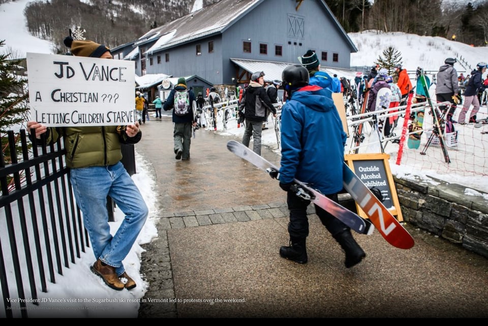 Mr. Vance’s trip to Vermont, one of the nation’s most liberal states, drew crowds of protesters on Saturday, just a day after the vice president had clashed with President Volodymyr Zelensky of Ukraine in the Oval Office. Demonstrators lined local roads and protested around Sugarbush, holding signs calling Mr. Vance a traitor and suggesting he “go ski in Russia.” Mr. Vance’s ski skills and possible attire were also mocked by some locals. (“Vance skis in jeans,” read one sign, highlighting a major ski faux pas, though Mr. Vance’s use of jeans could not be confirmed.)