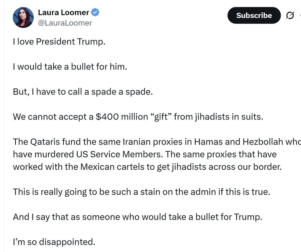 Trump can't abide flying around in crusty, old Air Force One. Qatar—funder of both Hamas and the leading U.S. college Gaza protest group—just happens to have a spare, pimped-out 747 lying around, which they'd like to gift to Trump so he can use that instead. Pay no attention to the complete hypocrisy of an administration that says that students protesting for Gaza are a threat to our foreign policy. (The Bulwark)