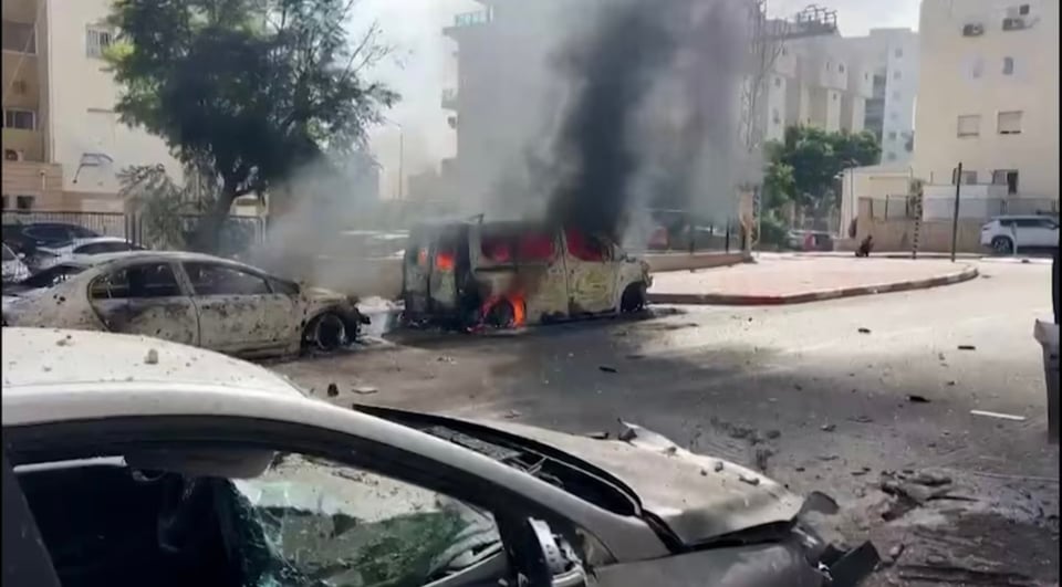 Vehicles were burning in Sderot, Israel, following an attack by Hamas.