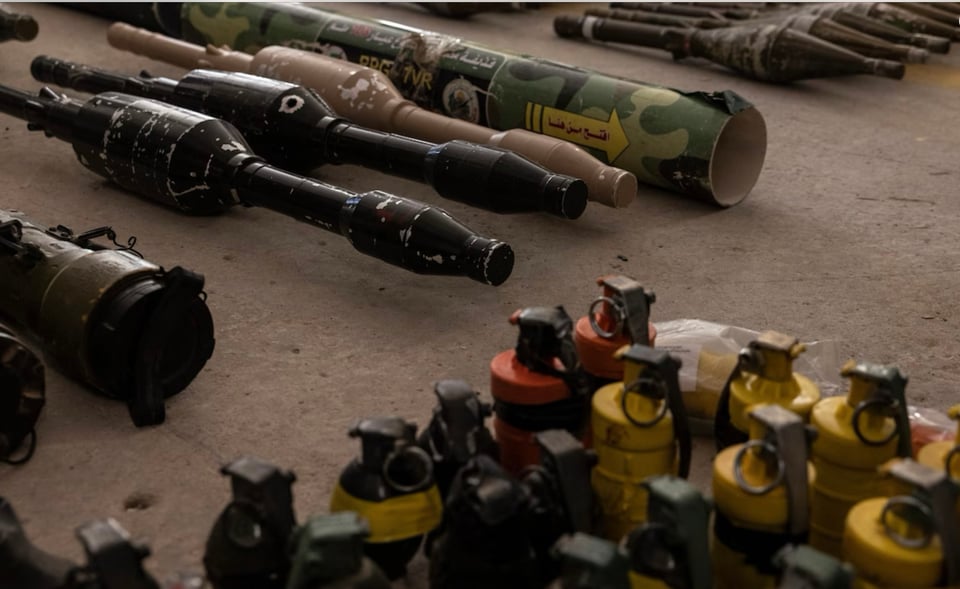 Captured Hamas weapons, including hand grenades and rocket-propelled grenades, are displayed during a news conference for foreign media at a military base in southern Israel on Oct. 20.