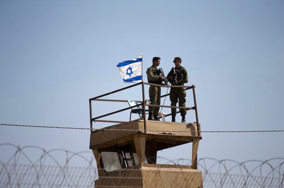 Israeli soldiers stand guard on a watchtower in a community along the Israel-Gaza border in 2018.