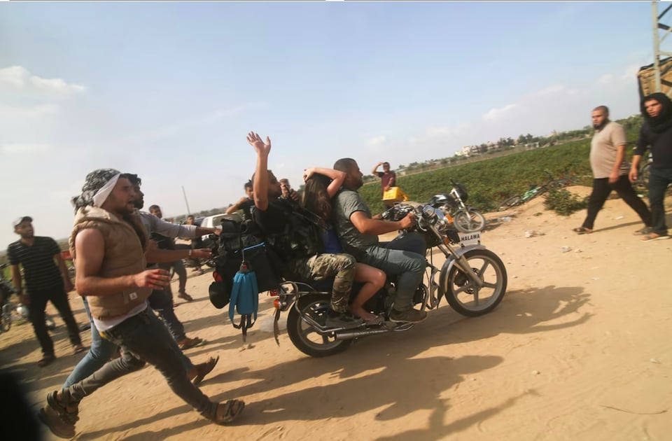Hamas militants transport a kidnapped Israeli, center, from the Kfar Azza kibbutz into the Gaza Strip on Oct. 7.