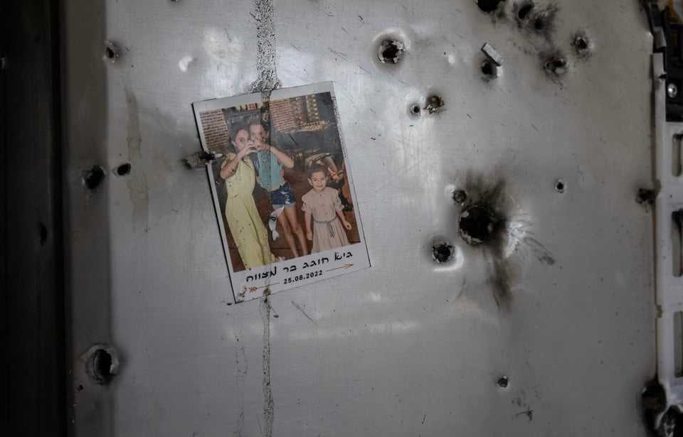 A family photograph of a bar mitzvah on a refrigerator riddled with bullet holes in a family’s home in Kibbutz Kissufim, Israel, on Oct. 18. Hamas militants attacked the kibbutz on Oct. 7, killing at least eight civilians and six Thai laborers while at least four people were abducted and taken to Gaza.