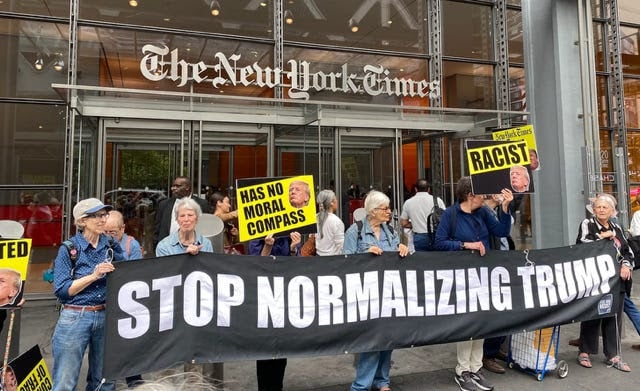 Members of Media and Democracy Project joined Rise and Resist's protest outside the New York Times offices in Manhattan on September 18th, 2024.