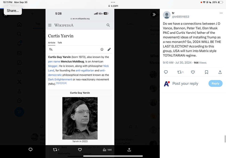 Hard to take this in. We will undoubtedly hear more about Yarvin and his philosophy embraced by Vance and others on the Right in the final weeks of the Election.