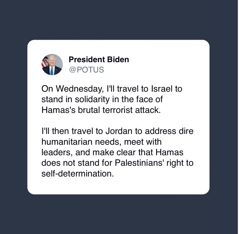Why it matters: The visit will be a show of support for Israel as it prepares for a ground offensive in Gaza and will be aimed at discouraging Iran and Hezbollah from joining the war. (Axios).