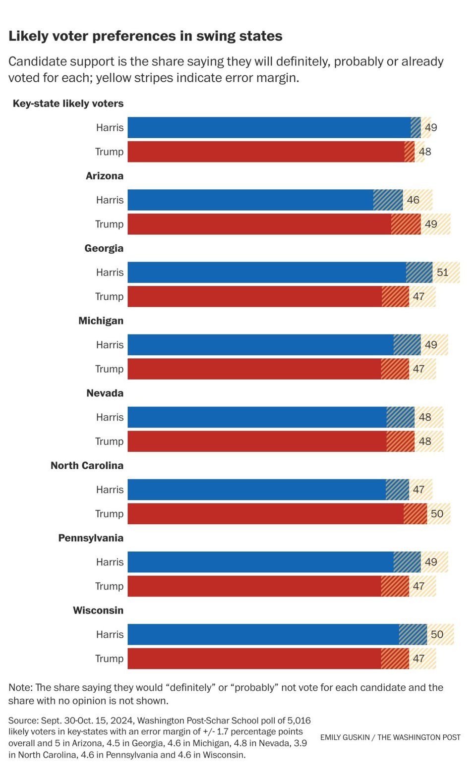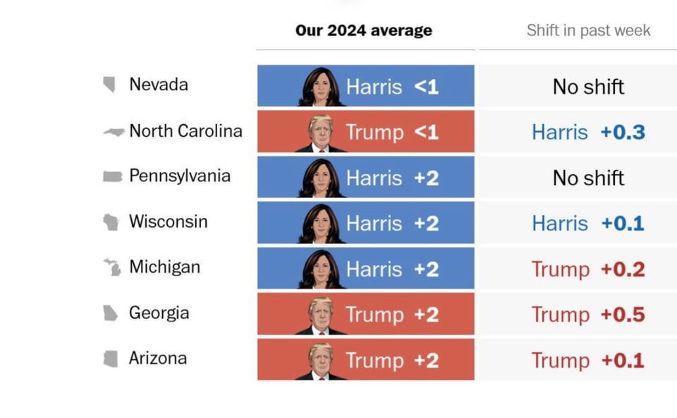 Here is today’s Washington Post battleground state poll average, an average which tries hard to screen out bad and R leaning polls. It shows Harris ahead, leading.