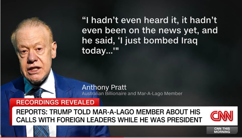 “It hadn’t even been on the news yet, and he said, ‘I just bombed Iraq today,’” Pratt said in one recording that was made public Sunday, recalling a conversation with Trump.