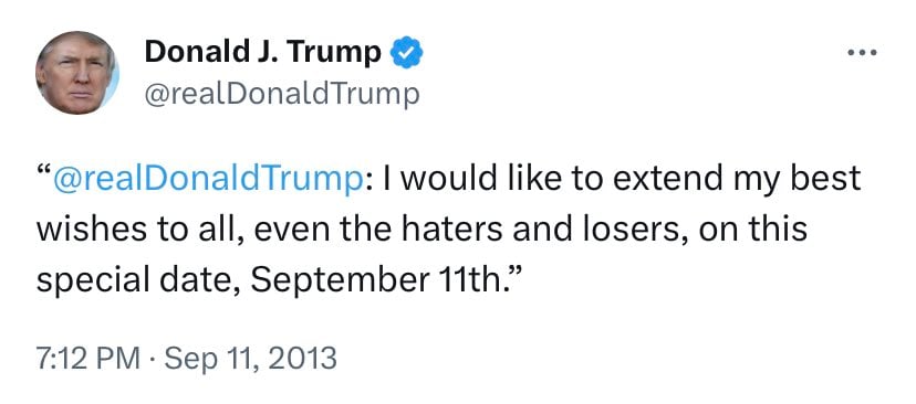 Never forget that Donald Trump's initial reaction to 9/11 was to boast that after the towers fell he suddenly owned the tallest building in downtown Manhattan.