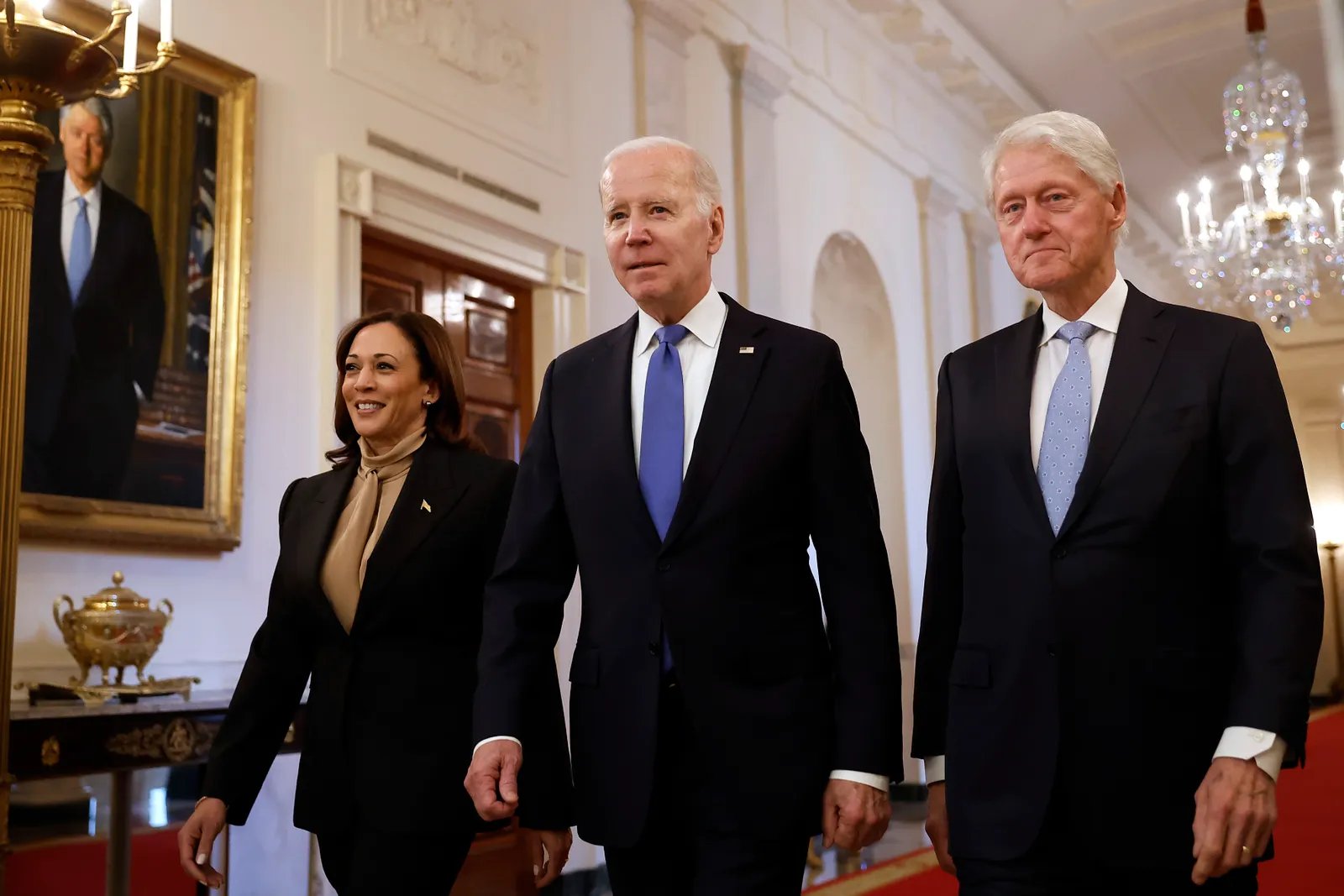 President Joe Biden and former President Bill Clinton walk into the East Room for an event to mark the 30th anniversary of the Family and Medical Leave Act at the White House on February 02, 2023 in Washington, DC. Some Democrats in Congress are calling on Biden to expand access to the FMLA by, in part, including a national 12-week paid family leave system as part of his proposed federal budget.