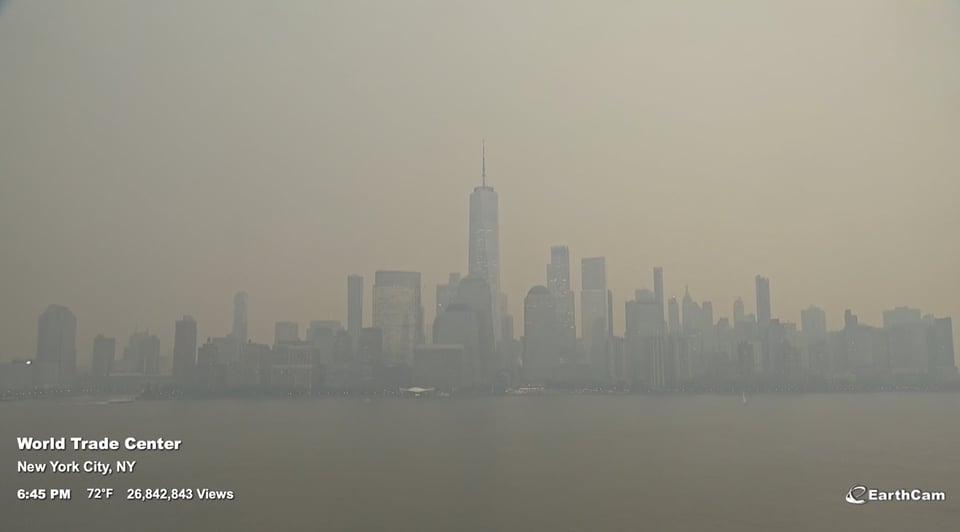 In Ontario, a layer of haze blanketed parts of Ottawa and Toronto, where Canadian officials warned residents about the poor air quality, as smoke floated over portions of New York State and Vermont. All of New York City was under an air quality alert on Tuesday because of the smoke; by the afternoon, the Manhattan skyline was obscured by hazy skies.