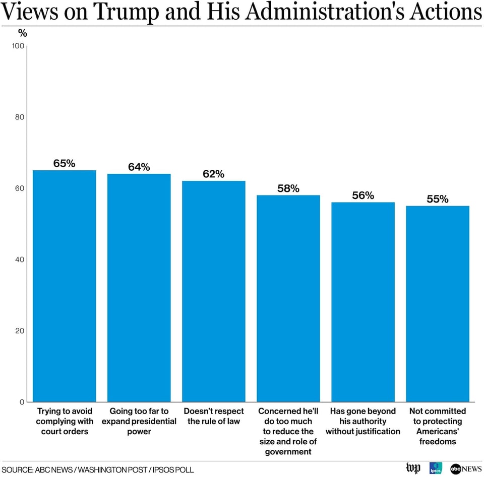 Negative assessments go beyond the economy. Sixty-five percent said Trump's administration is trying to avoid complying with federal court orders, and 64% said he's going too far in trying to expand presidential powers.