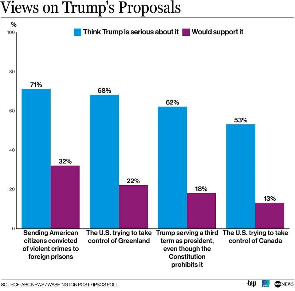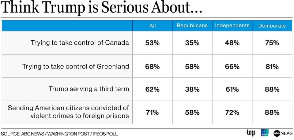 About 7 in 10 adults in this ABC News/Washington Post/Ipsos poll think Trump is serious when he talks about sending American citizens who are convicted of violent crimes to prisons in other countries (71%) and the United States trying to take control of Greenland (68%).