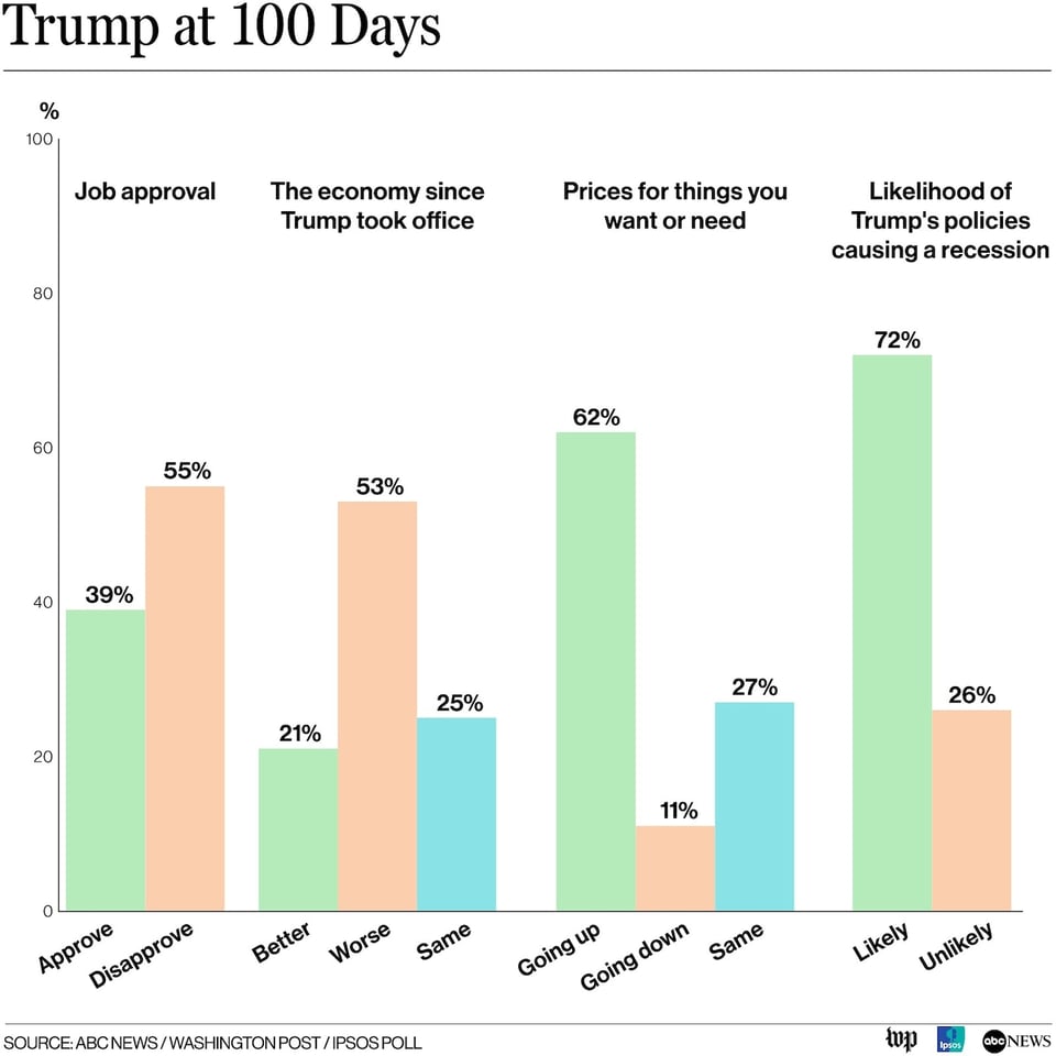 Donald Trump has the lowest 100-day job approval rating of any president in the past 80 years, with public pushback on many of his policies and extensive economic discontent, including broad fears of a recession, according to a new ABC News/Washington Post/Ipsos poll.
