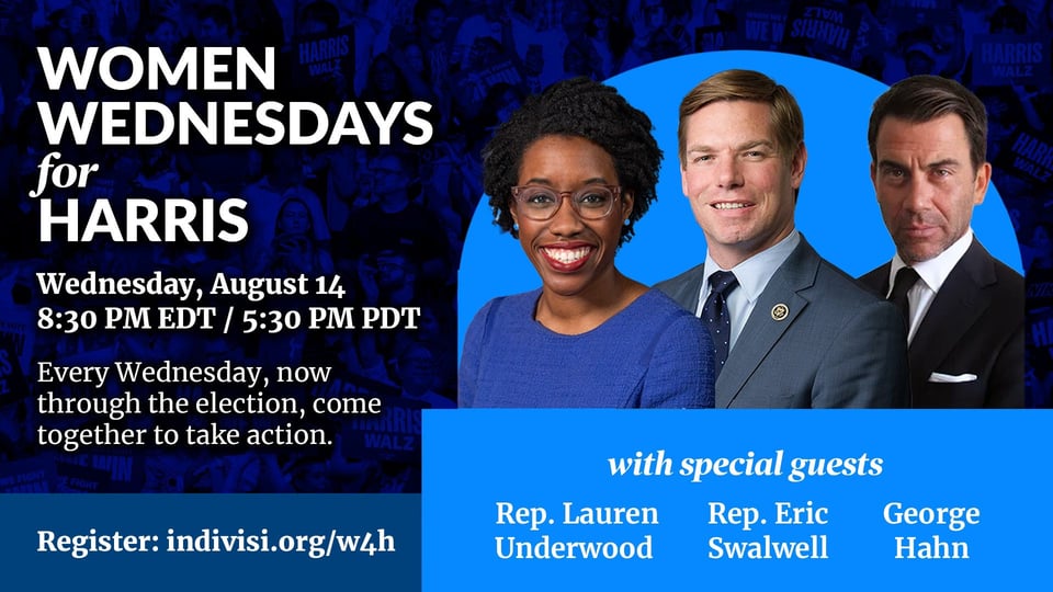 On Wed., Aug. 14 at 8:30 pm ET, join us to learn how to host a house party to help you connect to persuadable people, register them to vote, fundraise, and make a plan to GOTV from the inimitable George Hahn, Congressmembers Eric Swalwell and Lauren Underwood, activists Gina Ortiz Jones and Charlotte Clymer, Women for Harris leader Rhonda Foxx, and News Not Noise’s Jessica Yellin.
